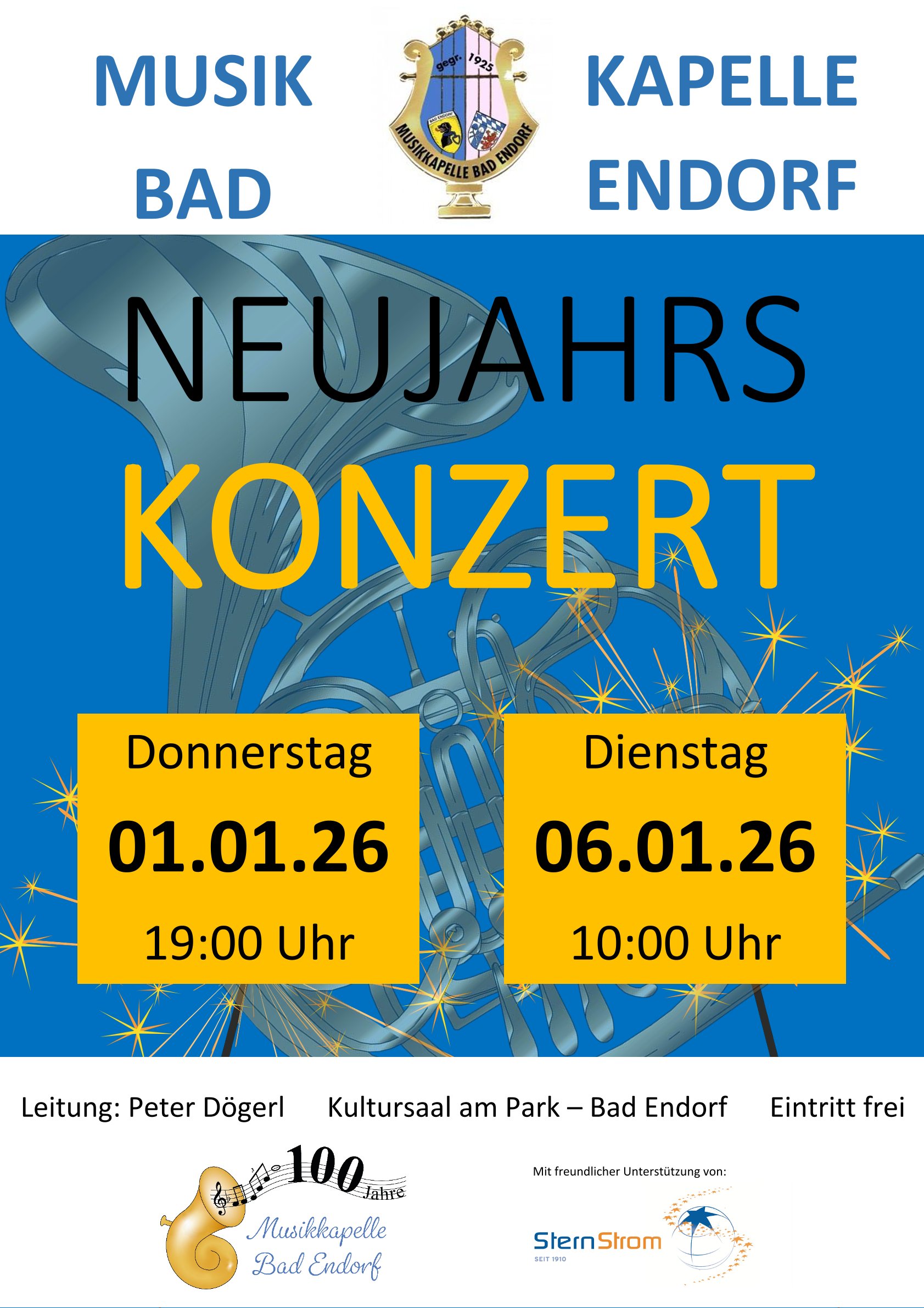 Neujahrskonzert 2026 Die Musikkapelle Bad Endorf unter der Leitung von Peter Dögerl eröffnet traditionell das neue Jahr im Kultursaal am Park. 20. Dezember 2019 mkadmin